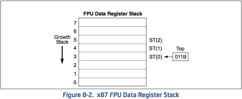 FPU registers are a stack of 8 data registers (ST(0) through ST(7)), indexed by the TOP flag. Instructions referencing ST(i) actually refer to st_registers[(TOP + i) % 8] in a register context.