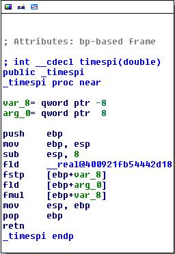This blog post will be a preview of McSema and will examine the challenges of translating a simple function that uses floating point arithmetic from x86 instructions to LLVM bitcode. The function we will translate is called timespi. It it takes one argument, k and returns the value of k * PI. Source code for timespi is below.
