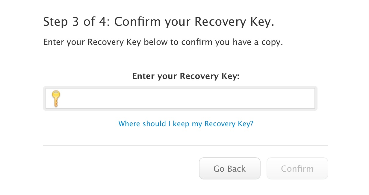 6. Apple will now ask you to re-enter your “Recovery Key”. This ensures that you have copied it down and it is now your responsibility to store it securely.