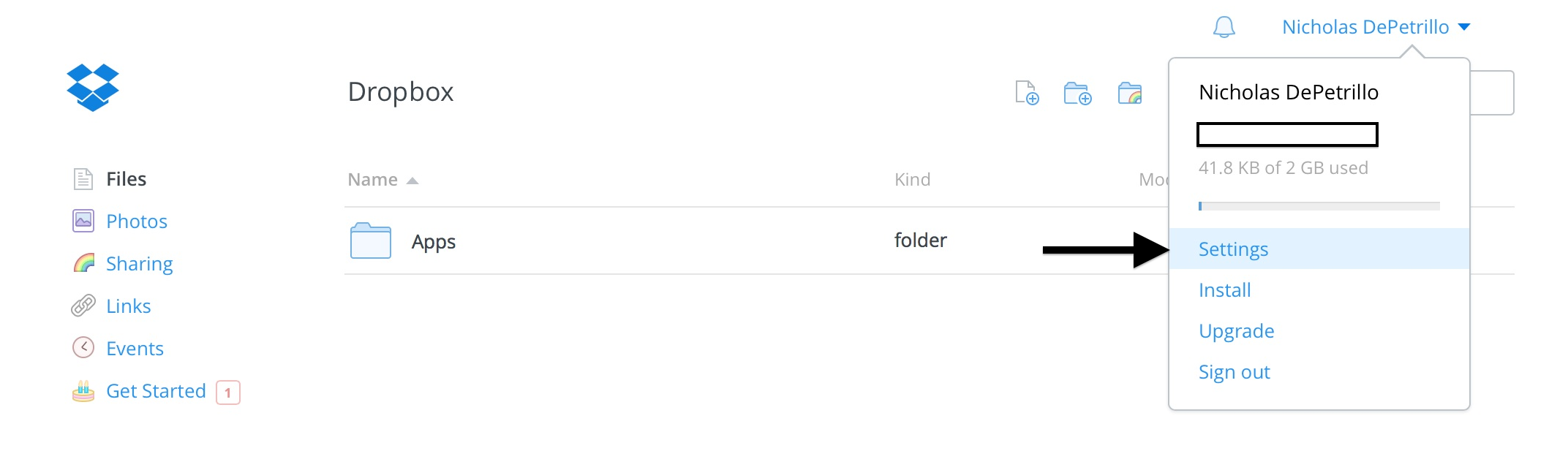 1. Login to your DropBox account and click your name in the top righthand corner of the screen. Select “Settings” from the drop down menu.