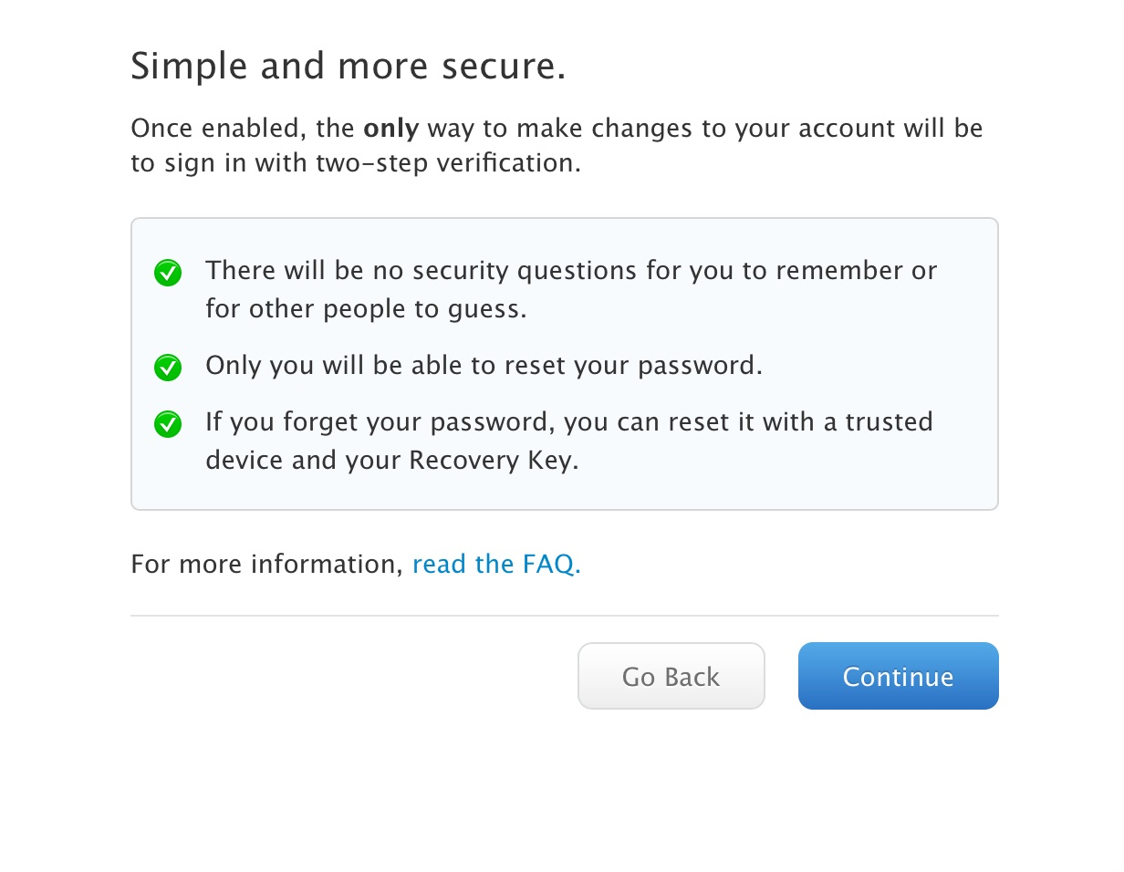 Congratulations! You’ve now enabled Two-Factor Authentication on your Apple ID account. Logout and log back in to try it out.