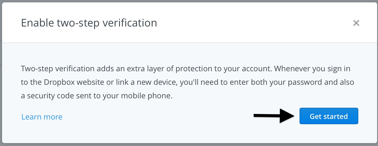 4. DropBox will display some information about their two-step verification process. Click “Get Started” to continue.