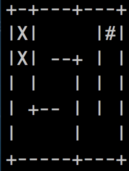 An example maze. The step spaces are blank, the walls are +-|, the END marker is the # sign, and the current path is the X’s.