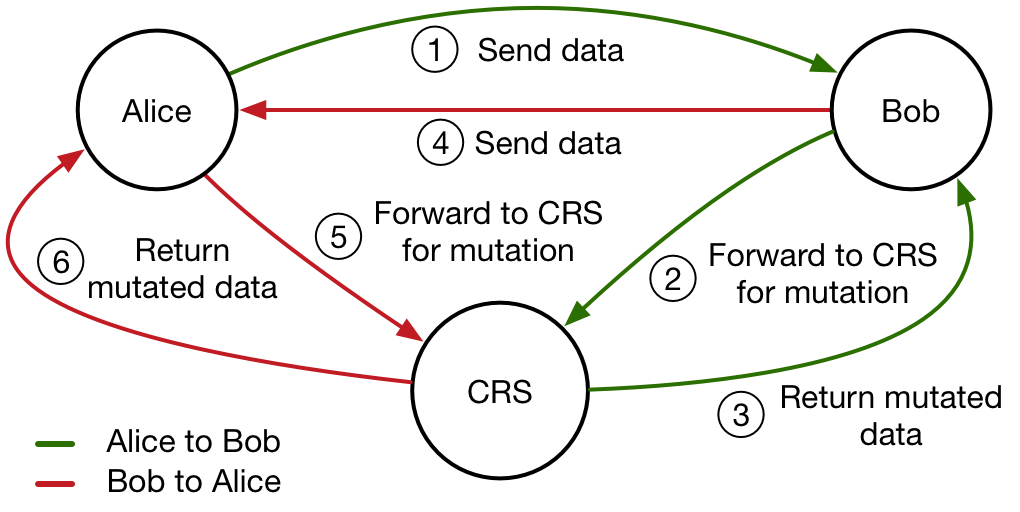 The CRS acts as a man-in-the-middle between two applications communicating using libotr.