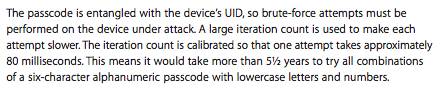 - [Apple] will ensure that when the FBI submits passcodes to the SUBJECT DEVICE, software running on the device will not purposefully introduce any additional delay between passcode attempts beyond what is incurred by Apple hardware.