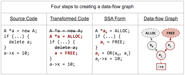 The most interesting step in the process is the why and how of transforming allocations and frees into special assignments. The “why” is that this transformation lets us repurpose an existing program analysis to find paths from FREE definitions to pointer dereferences. The how is more subtle: how does PointsTo know that it should change “new A” into an ALLOC and “delete a” into a FREE?