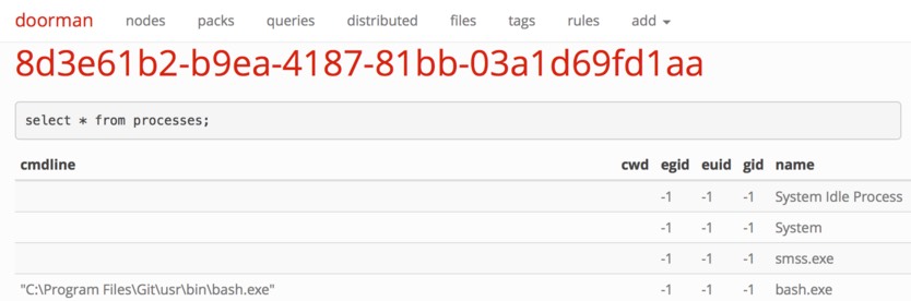 The Windows version of osquery can talk to existing osquery fleet management tools, such as doorman. osquery for Windows has full support for TLS remote endpoints and certificate validation, just like the Unix version. In this screenshot, we are using an existing doorman instance to find all running processes on a Windows machine.