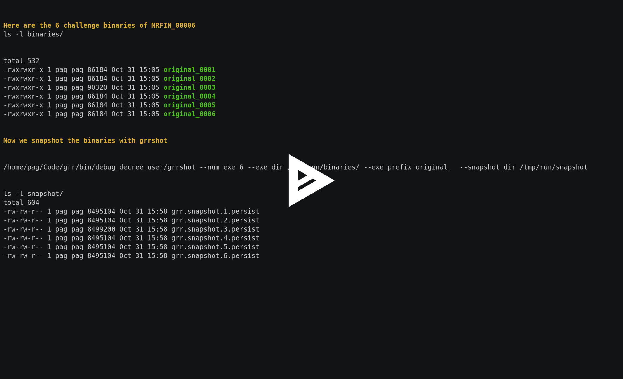 - GRR is efficient. GRR uses program snapshotting to skip over irrelevant setup code that executes before the first input byte is ever read. This saves a lot cycles in a fuzzing campaign with millions or billions of program executions. GRR also avoids kernel roundtrips by emulating system calls and performing all I/O within memory.