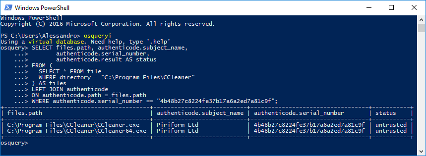 Recently, 2.27 million computers running Windows were infected with malware signed with a stolen certificate from the creators of a popular app called CCleaner, and inserted into its software update mechanism. Fortunately, signed malware is now simple to detect with osquery thanks to a pull request submitted by our colleague Alessandro Gario that adds Windows executable code signature verification (also known as Authenticode). This post explains the importance of code signatures in incident response, and demonstrates a use case for this new osquery feature by using it to detect the recent CCleaner malware.