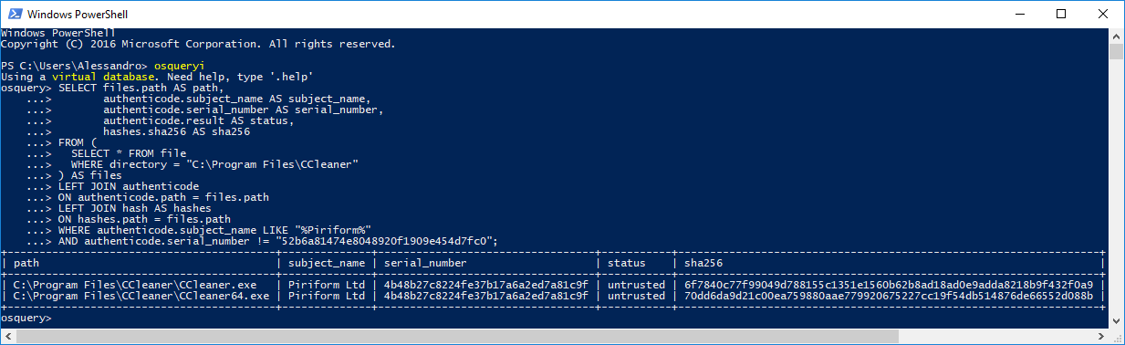 Here’s a simplified example of using osquery to check a Windows executable’s code signature: