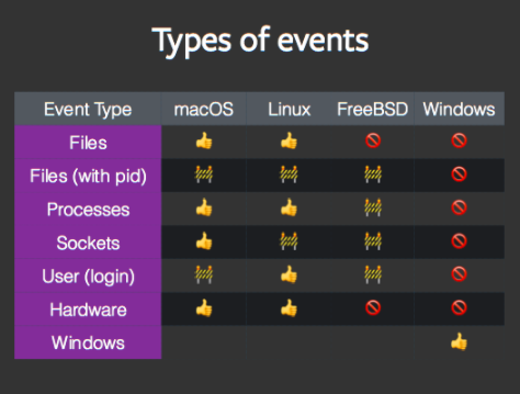 osquery handles file integrity and process auditing for MacOS and Linux. It can also monitor user access, hardware events, and socket events in select operating systems. It performs these tasks through interaction with the audit kernel API. Unlike its other pull-based queries, these monitoring services create event-based logs in real time and ensure that osquery doesn’t miss important events between queries. These features are essential to osquery’s power in incident detection.