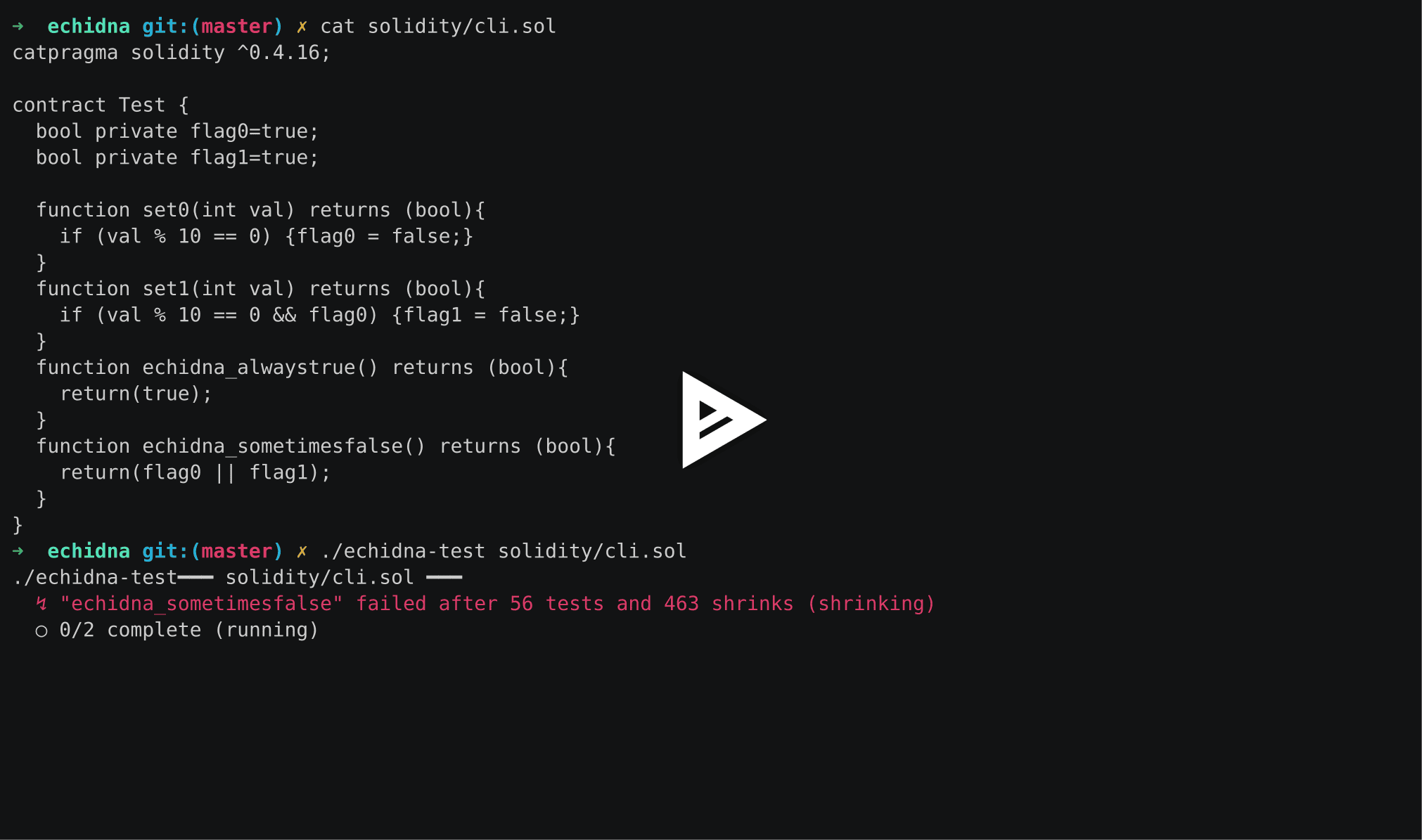 Echidna ships with an echidna-test executable, which can start finding bugs in your Solidity code in minutes, and a powerful and comprehensive library for writing your own analyses. echidna-test requires nothing other than simple Solidity assertions to find deep bugs and comes with a clear UI to make understanding its output easy. See a video of it in action: