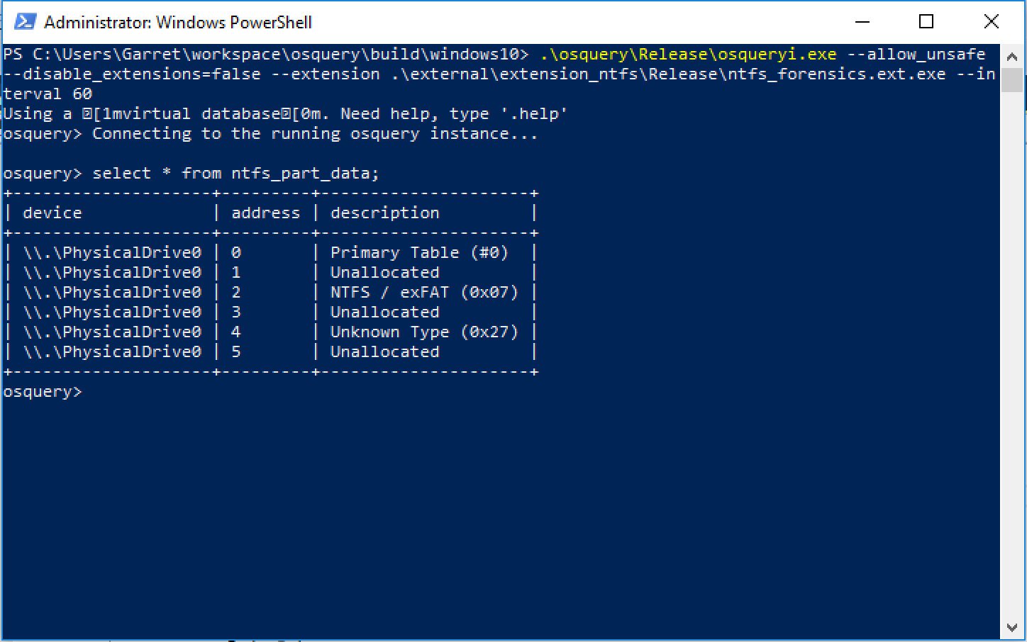 Load the extension at the startup of osquery with the command line argument, e.g., <code>osqueryi.exe --extension path\to\ntfs_forensics.ext.exe</code>. On loading, three new tables will be added to the database: ntfs_part_data, ntfs_file_data, and ntfs_indx_data.