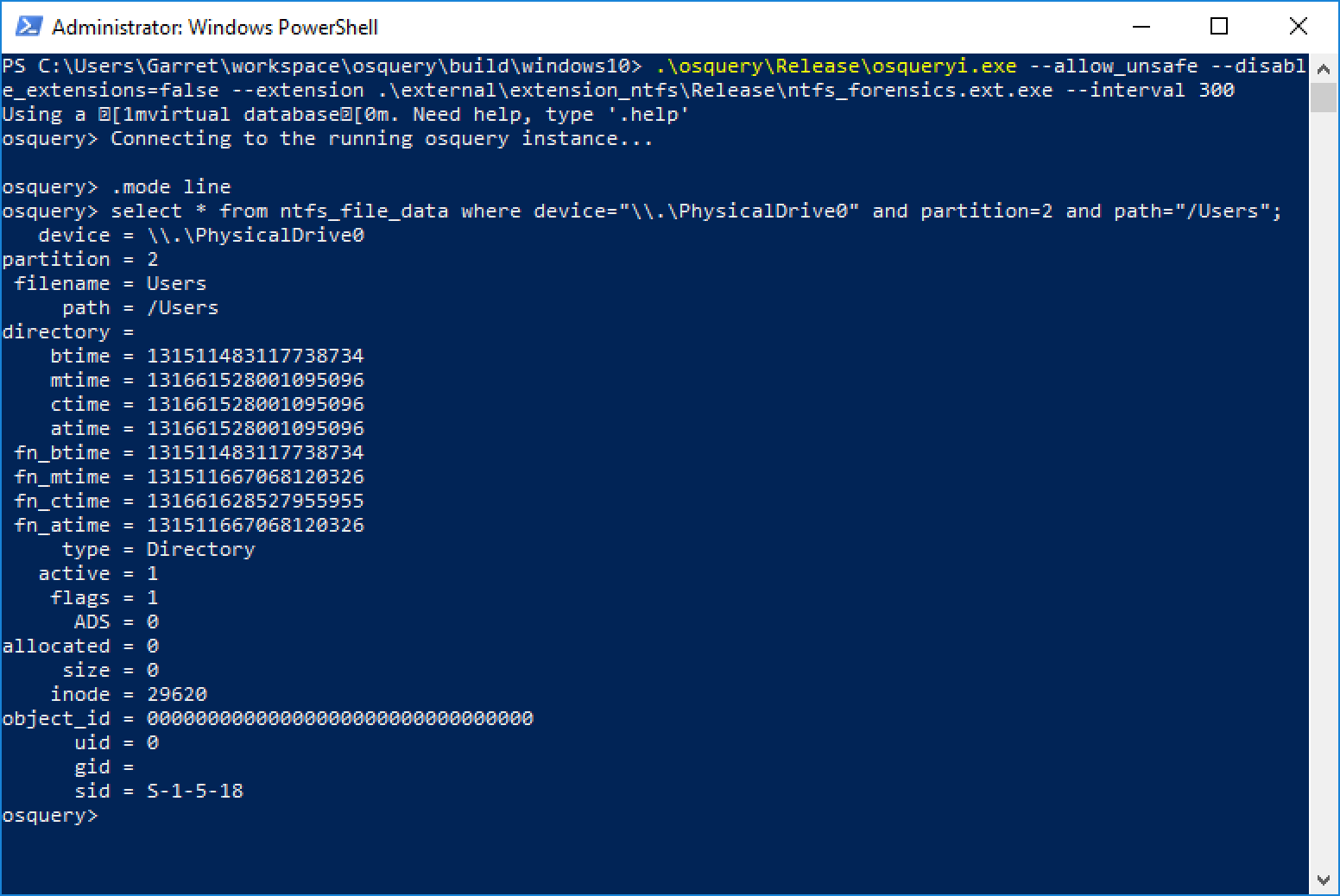 The NTFS forensics extension provides specific additional file metadata from NTFS images, including filename timestamp entries, the security descriptor for files, whether a file has Alternate Data Streams (ADS), as well as other information. It also provides index entries for directory indices, including entries that are deallocated. You can find the malware that just cleaned up after itself, or altered its file timestamps but forgot about the filename timestamps, or installed a rootkit in the ADS of calc.exe, all without ever leaving osquery.
