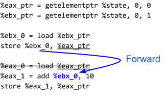 Our work could end here with the LSBV, but there are still potential improvements we can make to the DSE. As mentioned earlier, we can “forward” some instructions by replacing unnecessary sequences of storing a value, loading that value and using that value with direct use of the value prior to the store. This is handled by the ForwardingBlockVisitor, another backward block visitor. Using the aliases gathered by the FAV, it can iterate through the instructions of the block from back to front, keeping track of the upcoming loads to each slot of the State. If we find an operation occurs earlier that accesses the same slot, we can forward it to cut down on the number of operations, as shown in the earlier elimination example.