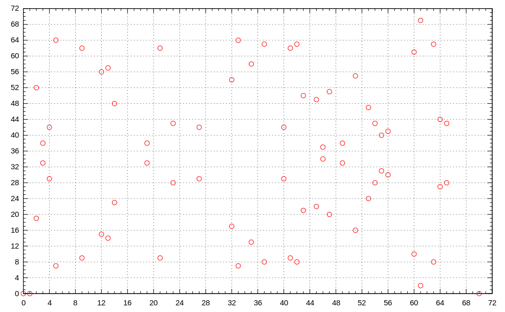 It’s quite a misnomer. In cryptography, an “elliptic curve” is neither elliptical nor a continuous curve. Instead, it’s a collection of (x, y) coordinates where x and y are between 0 and p, such that p is prime and y2 = x3 + ax + b mod p, plus a bonus “point at infinity,” which counterintuitively behaves much like zero; if you add it to anything, you get the same number back. Fig. 1 shows such a curve, where y2 = x3 - x, and x and y range from 0 to 71. (Technically, x and y are defined over a finite field, but all finite fields of the same order p are isomorphic when p is prime, so our definition is equivalent).