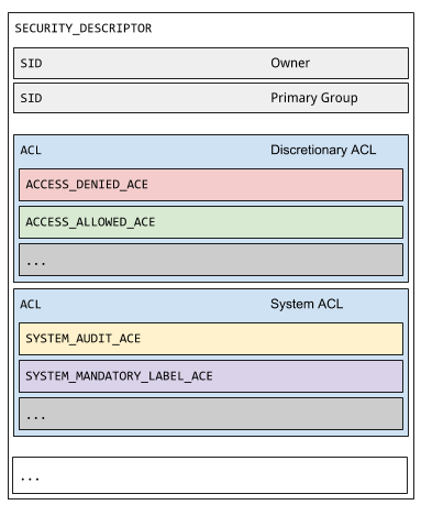 Windows has two types of ACLs: discretionary (DACL) and system (SACL). Every securable object in Windows (such as files, registry keys, events, etc.) has an associated security descriptor with a DACL and SACL.