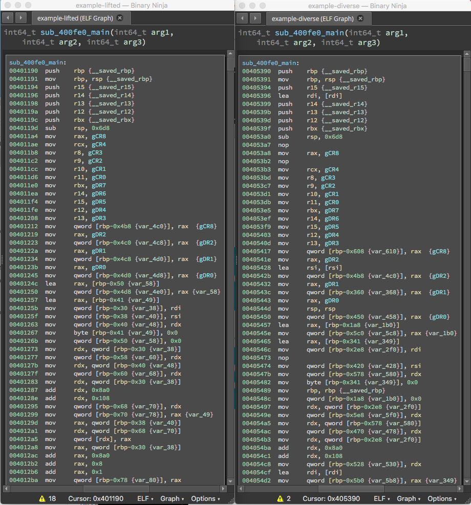 | Figure 3: The normal lifted binary (left) and its diversified equivalent (right). Both binaries are functionally identical, but look different at the binary level. Binary diversification protects software by preventing certain classes of bugs from turning into exploits. |