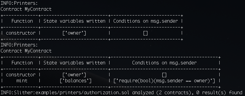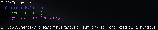 Slither comes with a set of predefined “printers” which show high-level information about the contract. We included four that work out-of-the-box to print essential security information: a contract summary, a function summary, a graph of inheritance, and an authorization overview.