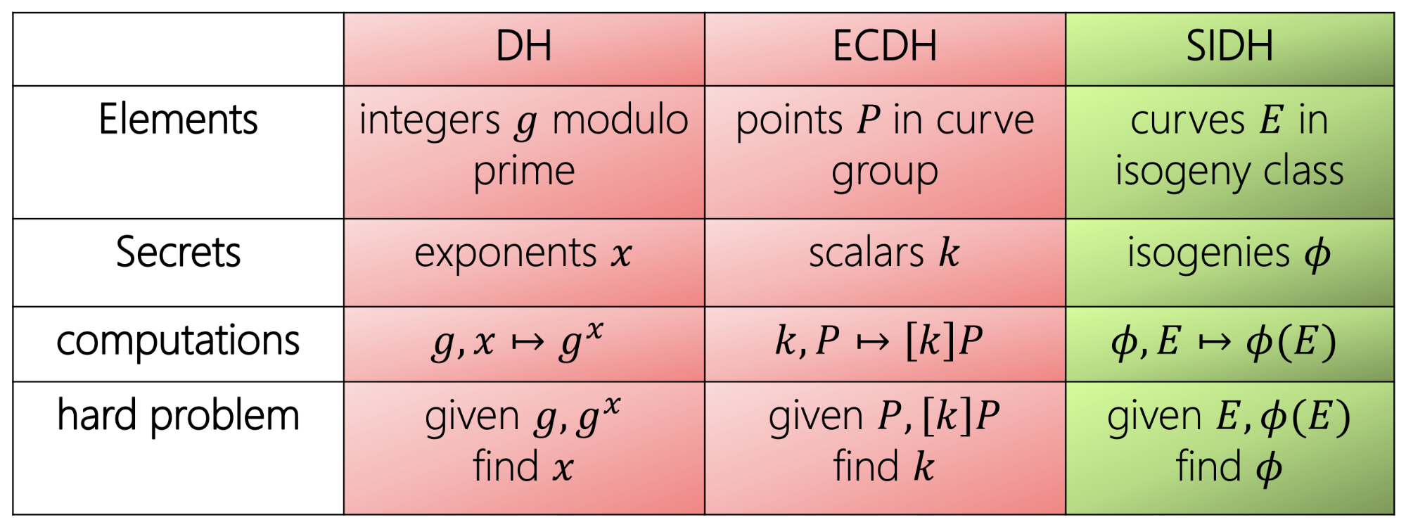 The field of elliptic-curve cryptography is somewhat notorious for using quite a bit of arcane math. Isogenies take this to a whole new level. In elliptic-curve cryptography we use a Diffie-Hellman type protocol to acquire a shared secret, but instead of raising group elements to a certain power, we walk through points on an elliptic curve. In isogeny-based cryptography, we again use a Diffie-Hellman type protocol but instead of walking through points on elliptic curve, we walk through a sequence of elliptic curves themselves.