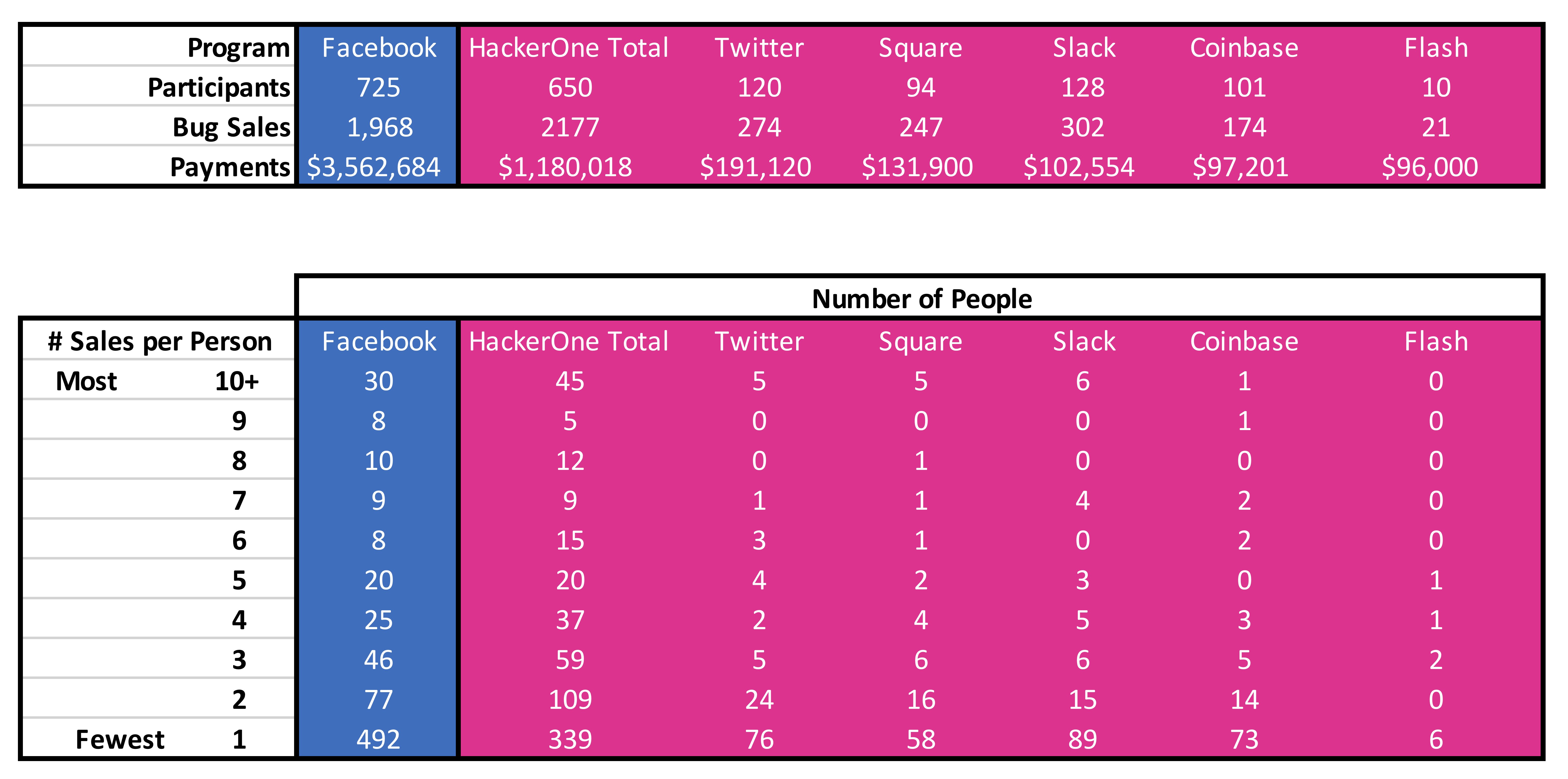 In Fixing a Hole, independent researchers funded by Facebook studied data from 61 HackerOne bounty programs over 23 months and one Facebook program over 45 months. The HackerOne data set includes bounty programs from Twitter, Square, Slack, Coinbase, Flash, and others. Usernames could be tracked across different programs in the HackerOne data set, but not to the Facebook data set.