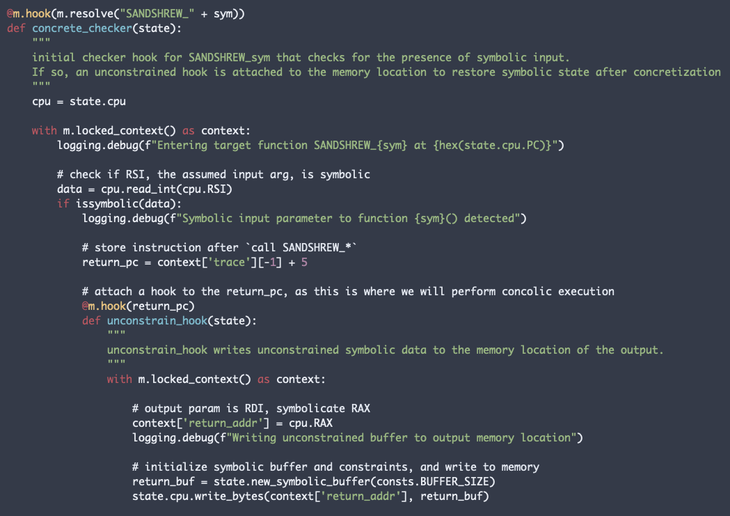 Sandshrew leverages a symbolic environment through the robust Manticore binary API. I implemented the manticore.resolve() feature for ELF symbol resolution and used it to determine memory locations for user-written SANDSHREW_* functions from the GOT/PLT of the test case binary.