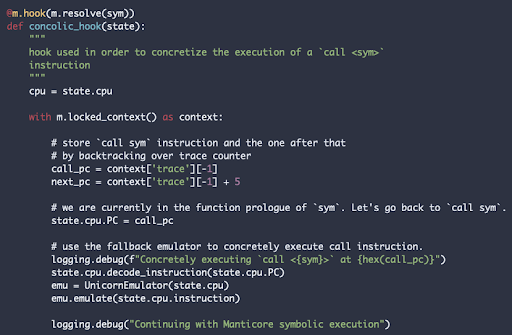 Fig 2. Using Manticore’s UnicornEmulator feature in order to concretize a call instruction to the target crypto primitive.
