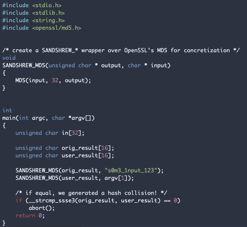 We first write and compile a test case that tests an individual cryptographic primitive or function for equivalence against another implementation. The example shown in Figure 1 tests for a hash collision for a plaintext input, by implementing a libFuzzer-style wrapper over the MD5() function from OpenSSL. Wrappers signify to sandshrew that the primitive they wrap should be concretized during analysis.