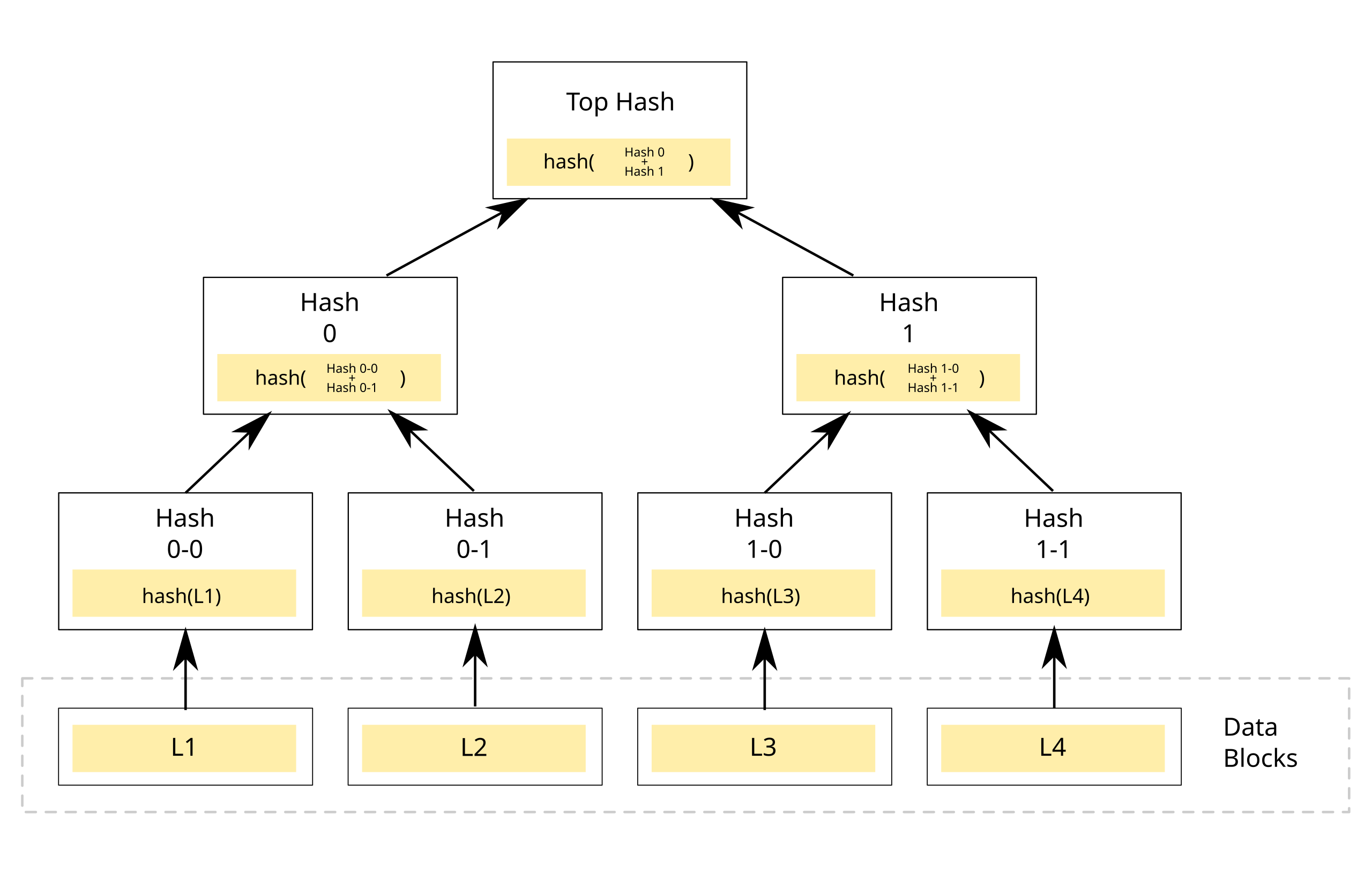 An example of a binary hash tree. Hashes 0-0 and 0-1 are the hash values of data blocks L1 and L2, respectively, and hash 0 is the hash of the concatenation of hashes 0-0 and 0-1 (Image and caption from Wikimedia)