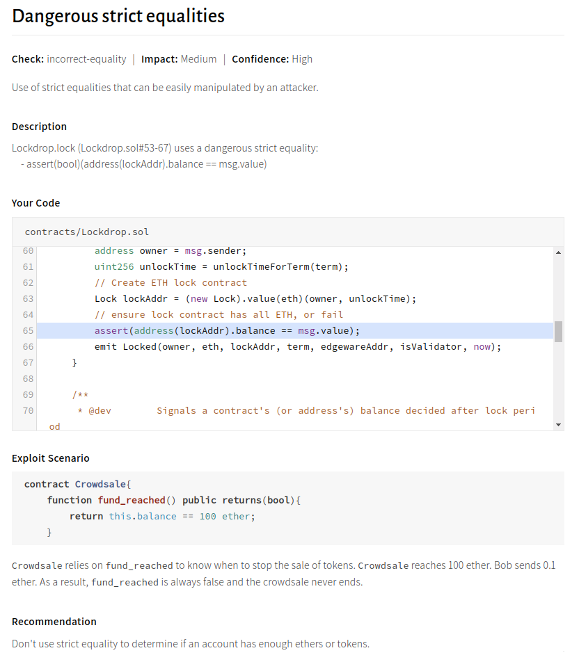 In the case of the Lockdrop contract, Slither’s dangerous-strict-equality detector generates such an alert because msg.value and an address balance are used in a strict equality comparison within an assertion. This is a textbook example of a strict equality vulnerability which is caught effortlessly by Slither. We also verified that this alert is not present in the recently fixed code.