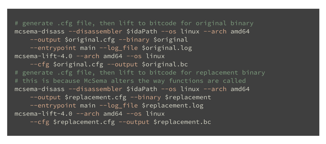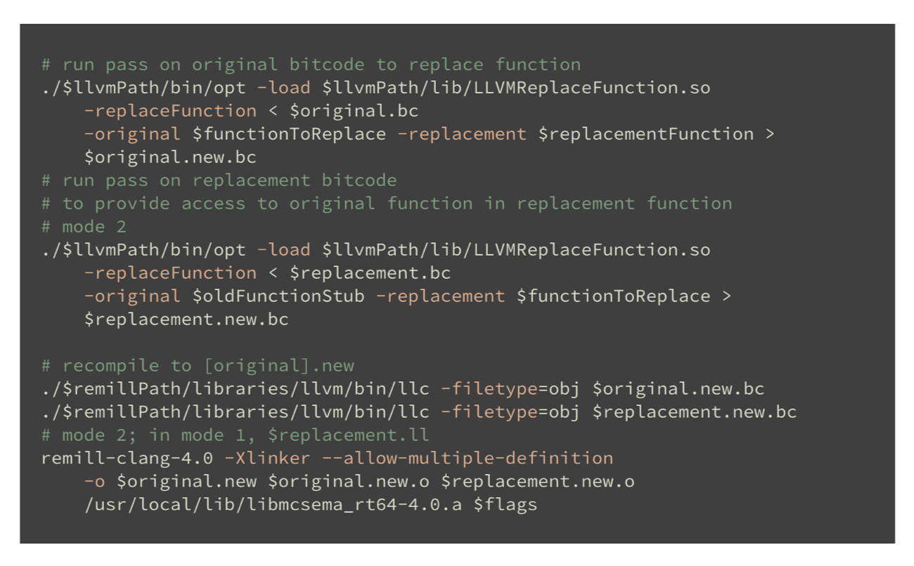Although the LLVM pass does the work of replacing a given function, it is wrapped with the other steps in a bash script that implements the full process. First, we disassemble and lift both input binaries using McSema.