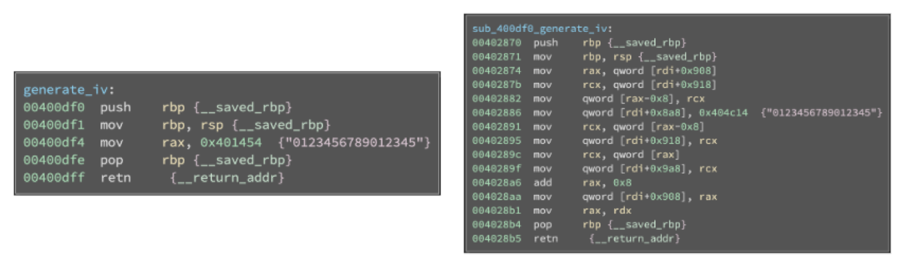 Using this tool, it becomes possible to automatically fix a cryptographic IV vulnerability. As seen below, the original binary encrypts a message identically each time using a static IV. After running Fennec, however, the newly created binary uses a different IV, thereby producing a unique ciphertext each time it is run, even on the same plaintext (blue).