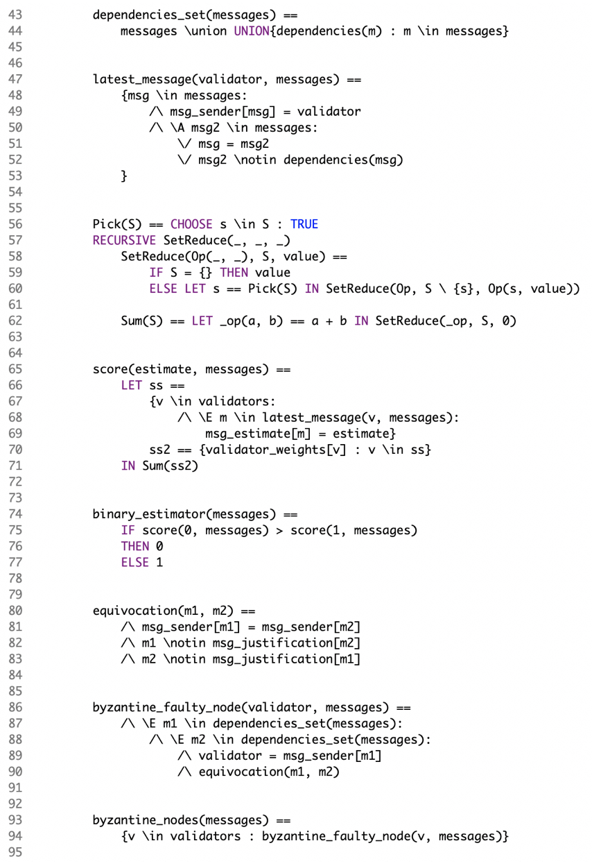 The assumption is that all the messages are sent and received successfully without time delay. The specification does not include message authentication, because it is assumed that the validators can verify the authenticity and source of messages. In this implementation, equivocating validators behave such that they take different subsets of all received messages, use these subsets to obtain the estimates, and send different messages to different validators.