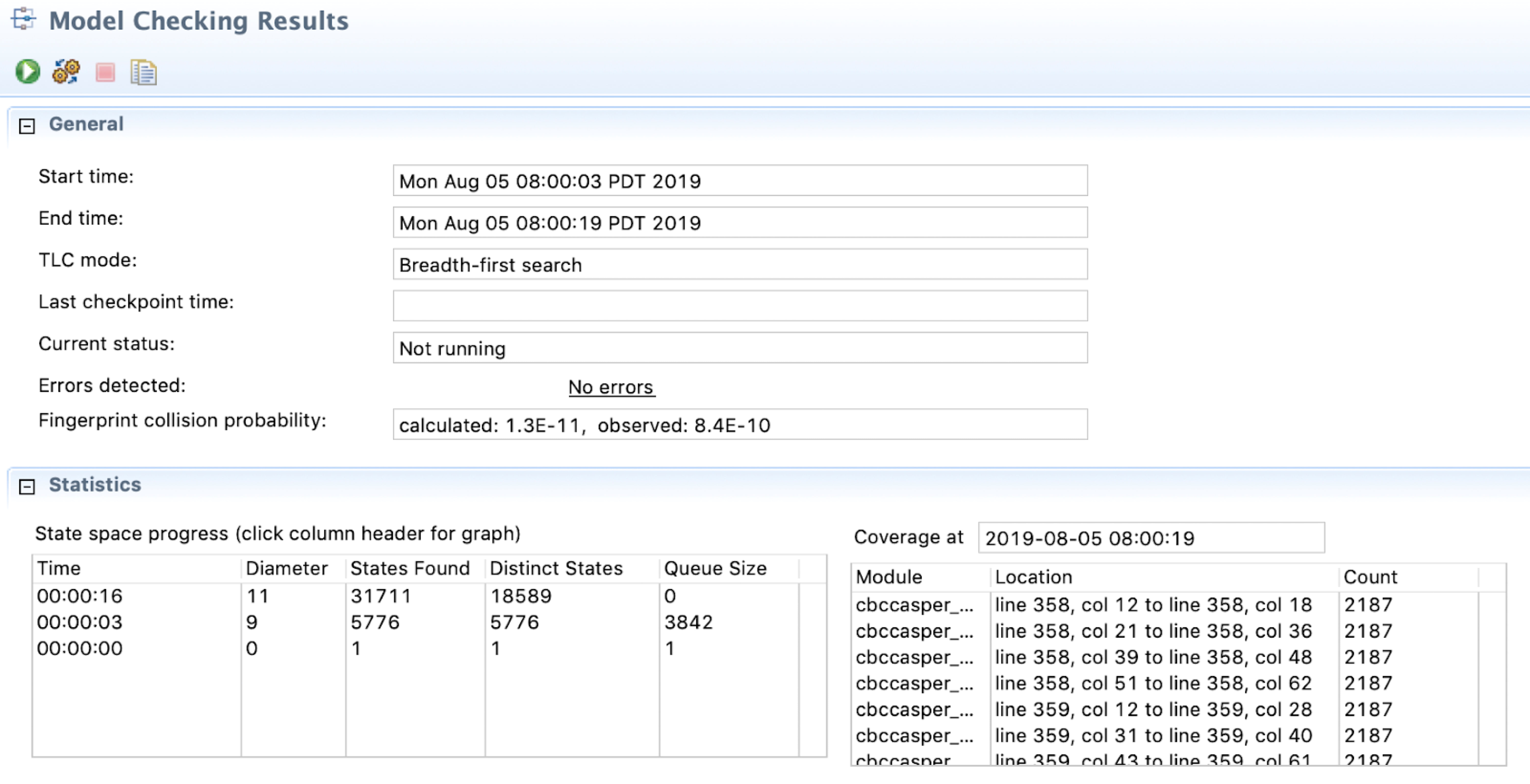The TLC model checker checks that eventually a clique will be found where all the non-Byzantine nodes can mutually see each other agreeing with a certain estimate in messages, and cannot see each other disagreeing. When this condition is met, finality is achieved, and the model checker should terminate without giving errors, as shown in Figure 3.