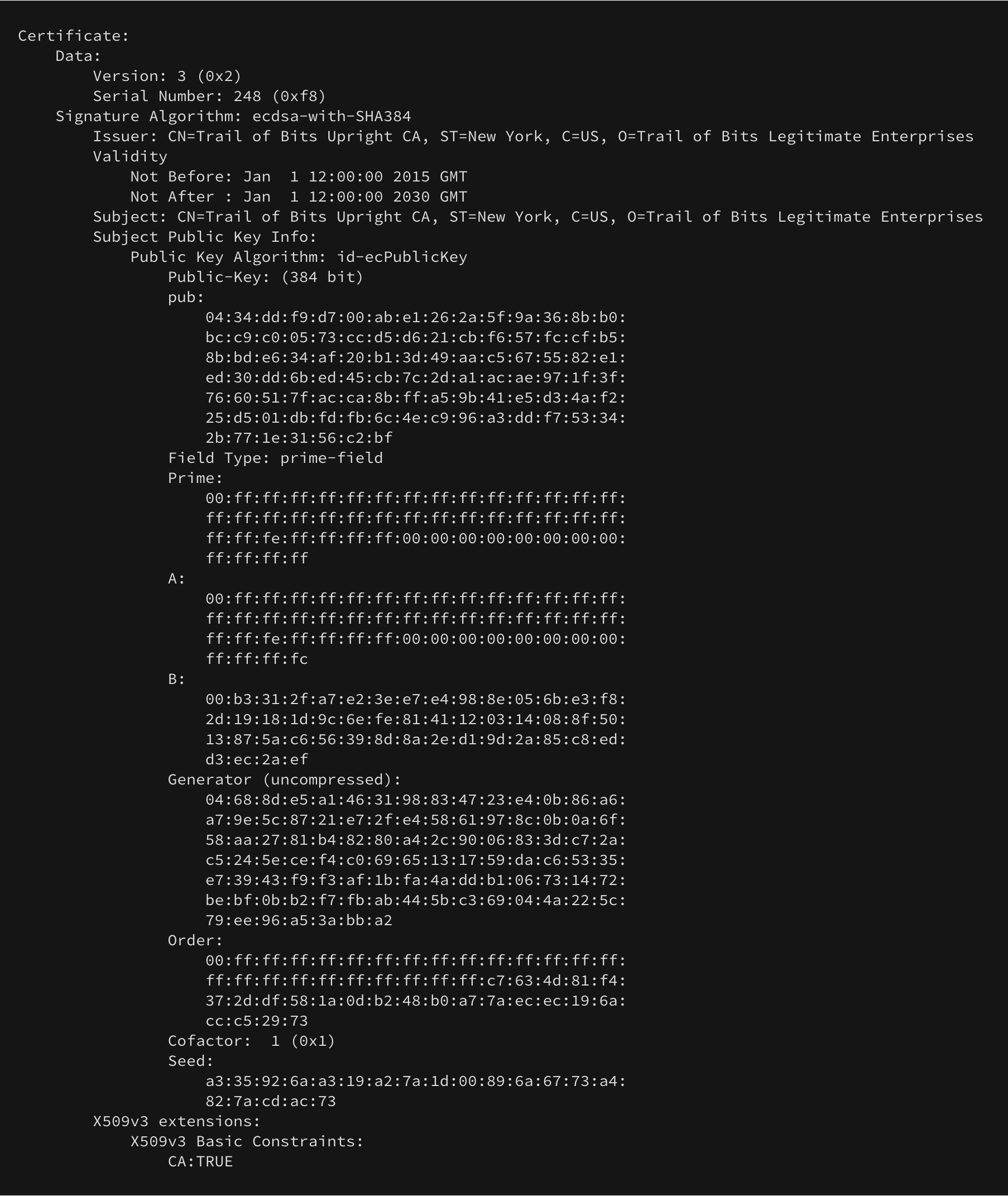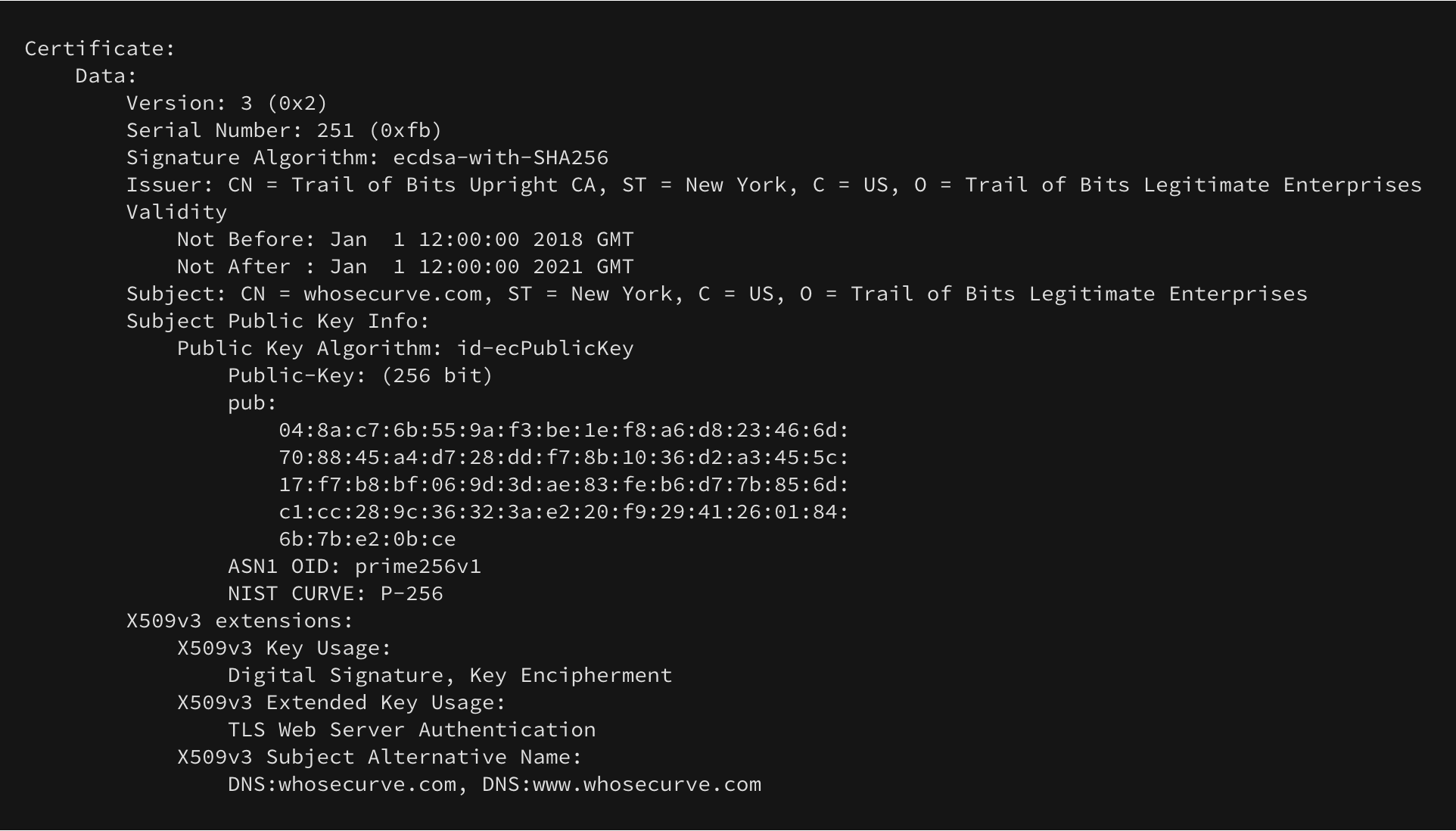 Now that we have some background on elliptic curves, it’s not hard to see that the attack works basically the same as with DSA: Change the parameters specifying ECDSA to have a generator corresponding to a private key you know, but with the same public key as the certificate authority you’re trying to spoof. By editing the parameters, we can control the effective secret key for the certificate, and use it to attest to whatever identities we’d like.