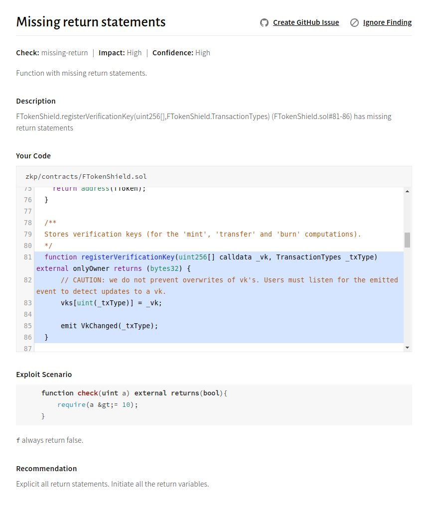 FTokenShield.registerVerificationKey and NFTokenShield.registerVerificationKey return an empty bytes32. It is unclear what the correct returned value should be. This might lead to unexpected behavior for third parties and contracts.