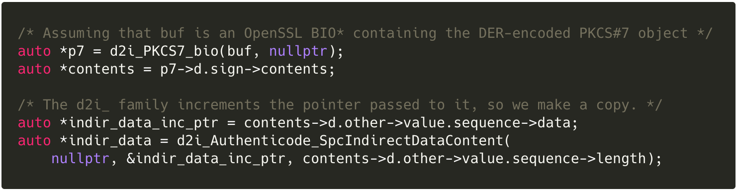 With our structures in place, we can use OpenSSL’s (mostly) undocumented PKCS#7 API to parse our SignedData and indirect data contents:
