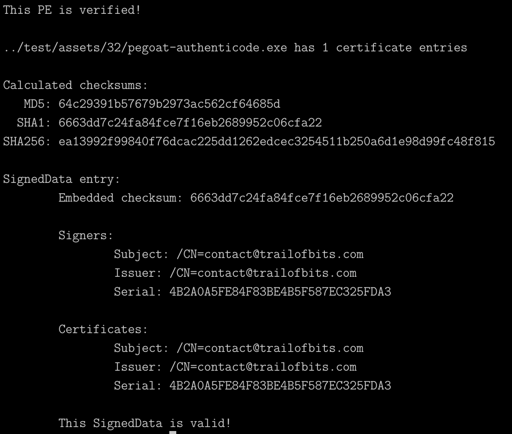 We’ve covered all four major components of Authenticode above: verifying the signature, checking the integrity of the file against the verified hash, calculating page hashes, and verifying any timestamp countersignatures.