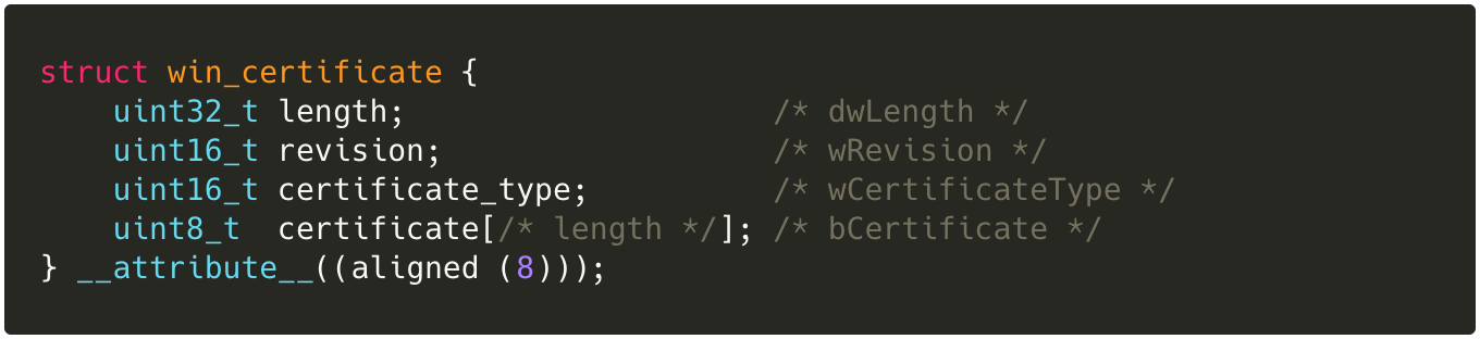 Once located, actually parsing the certificate table is straightforward: It’s an 8 byte-aligned blob of WIN_CERTIFICATE structures: