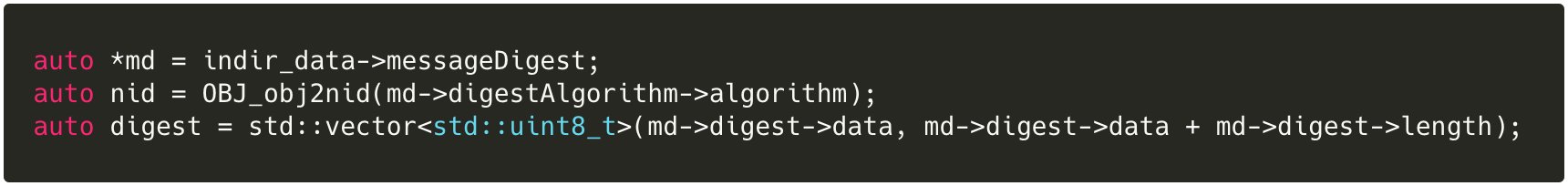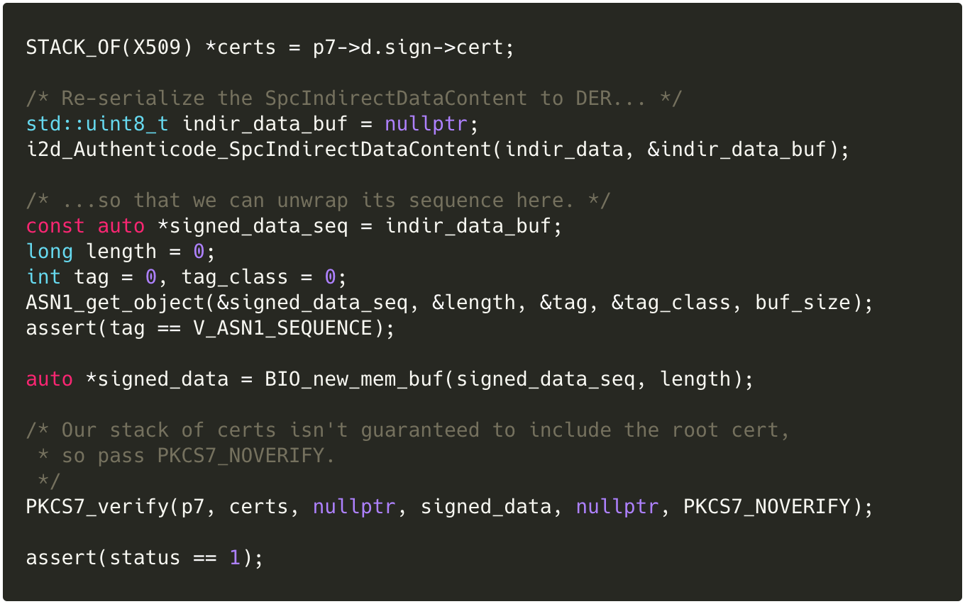 With our structures in place, we can use OpenSSL’s (mostly) undocumented PKCS#7 API to parse our SignedData and indirect data contents: