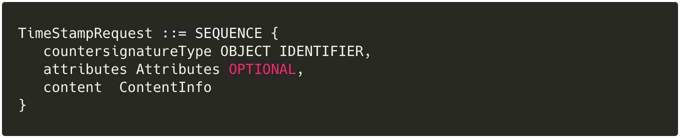 • When issuing a timestamp request (TSR) to a timestamp authority (TSA), the request takes the form of an HTTP 1.1 POST containing a DER-encoded, then base64-encoded ASN.1 message:…where countersignatureType is the custom Microsoft OID 1.3.6.1.4.1.311.3.2.1 (i.e., SPC_TIME_STAMP_REQUEST_OBJID) and content is the original Authenticode PKCS#7 ContentInfo.
