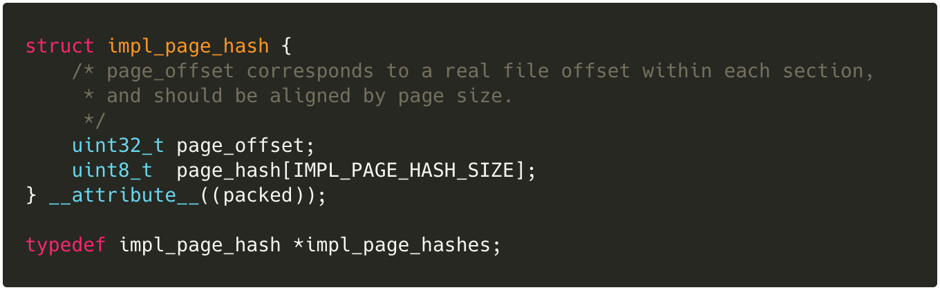 …where IMPL_PAGE_HASH_SIZE is determined by the hash algorithm used (i.e., by Impl_SpcPageHash.type), and the very first entry in the table is a null-padded “page hash” for just the PE headers with page_offset=0. This table is not given an ASN.1 definition—it’s inserted directly into Impl_SpcPageHash.pageHashes.