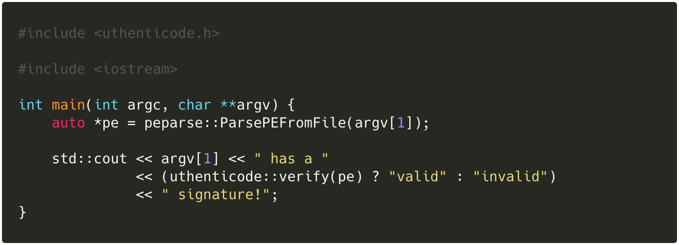 μthenticode’s’ APIs are fully documented and hosted, and most can be used immediately with a peparse::parsed_pe *:
