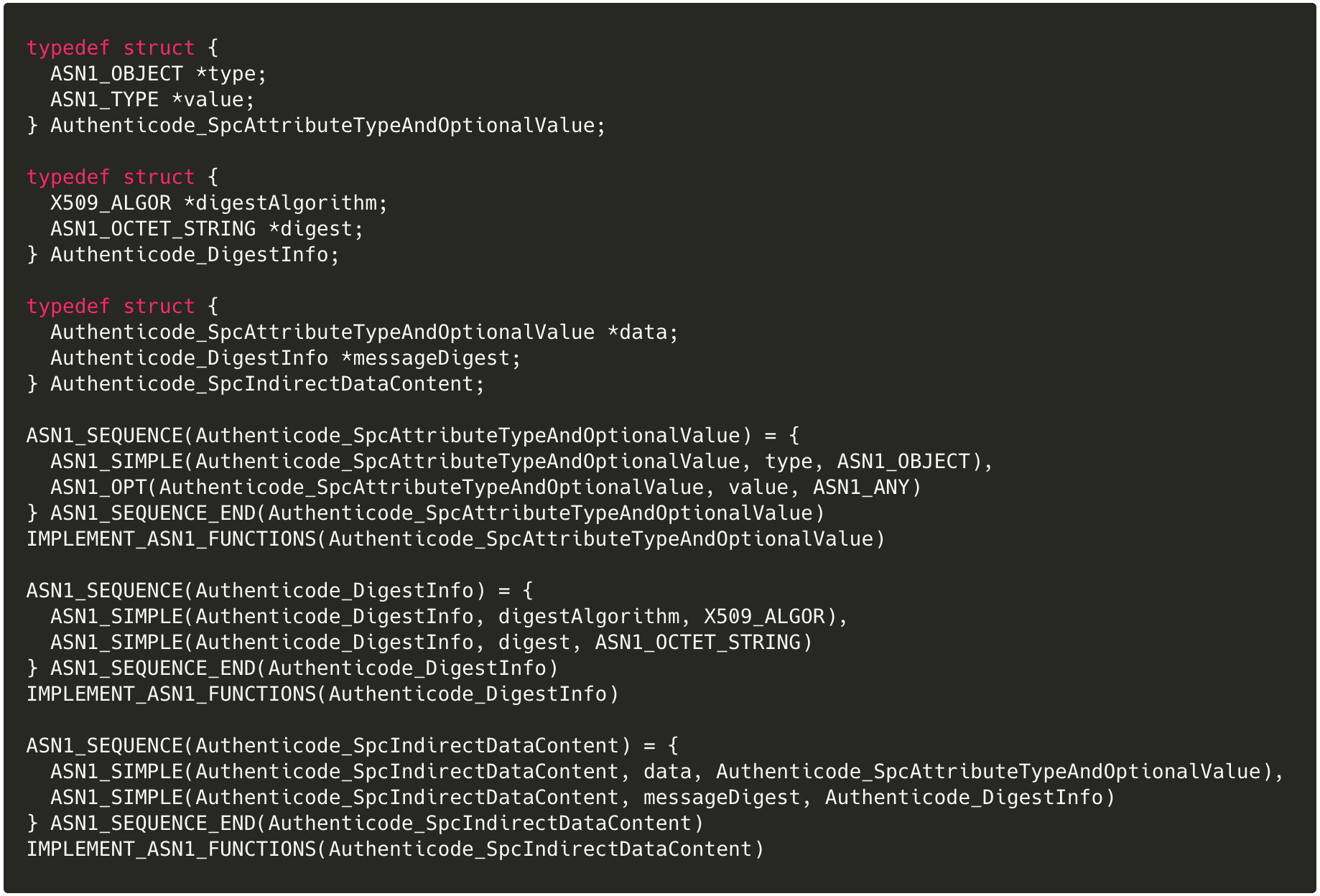 Given the ASN.1 definitions above, we can use OpenSSL’s (hellish and completely undocumented) ASN.1 macros to parse Microsoft’s custom structures: