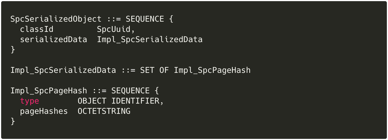 • The serializedData of each SpcSerializedObject is an ASN.1 SET, each member of which is an ASN.1 SEQUENCE, to the effect of:(The definitions above are my reconstruction from the body of get_page_hash_link; osslsigncode confusingly reuses the SpcAttributeTypeAndOptionalValue type for Impl_SpcPageHash and constructs the rest of the contents of SpcSerializedObject manually.)