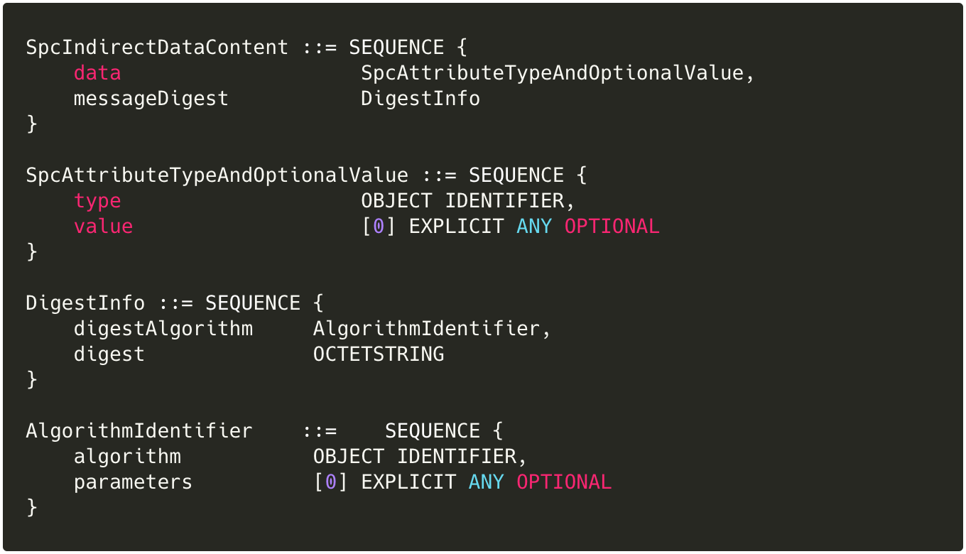 • The structure corresponding to this object identifier (OID) is documented as SpcIndirectDataContent. Microsoft conveniently provides its ASN.1 definition: