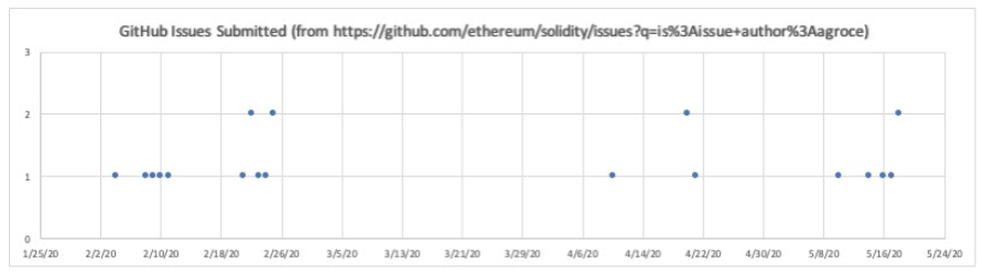You may notice that the last spike in submitted bugs comes long after the last commit made to our AFL-compiler-fuzzer repository. Did we make local changes that aren’t yet visible? No, we just changed the corpus we used for fuzzing. In particular, we looked beyond the syntax tests, and added all the Solidity source files we could find under test/libsolidity. The most important thing this accomplished was allowing us to find SMT checker bugs, because it brought in files that used the SMTChecker pragma. Without a corpus example using that pragma, AFL has essentially no chance of exploring SMT Checker behaviors.
