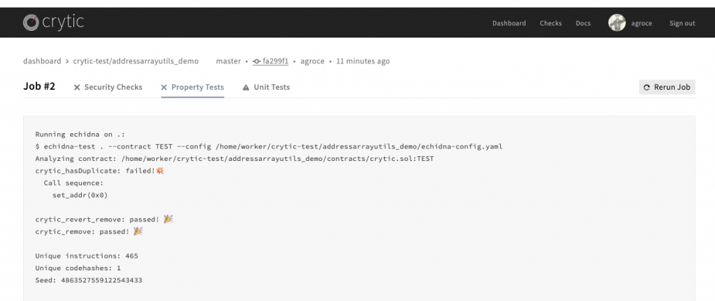 You can run Echidna tests on your own by downloading and installing the tool or using our docker build—but using the Crytic platform integrates Echidna property-based testing, Slither static analysis (including new analyzers not available in the public version of Slither), upgradability checks, and your own unit tests in a seamless environment tied to your version control. Plus the addressarrayutils_demo repository shows all you need for property-based testing: It can be as simple as creating a minimal Truffle setup, adding a crytic.sol file with the Echidna properties, and turning on property-based tests in your repository configuration in Crytic.