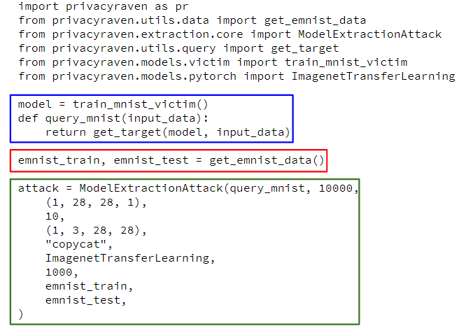 Inside the blue box, a query function is created for a PyTorch Lightning model included with the library (executed after the requisite components are imported). To accelerate prototyping, PrivacyRaven includes a number of victim models. The target model in this example is a fully connected neural network trained on the MNIST dataset. The single line inside of the red box downloads the EMNIST dataset to seed the attack. The bulk of the attack is the attack configuration, located in the green box. Here, the copycat synthesizer helps train the ImageNetTransferLearning classifier.