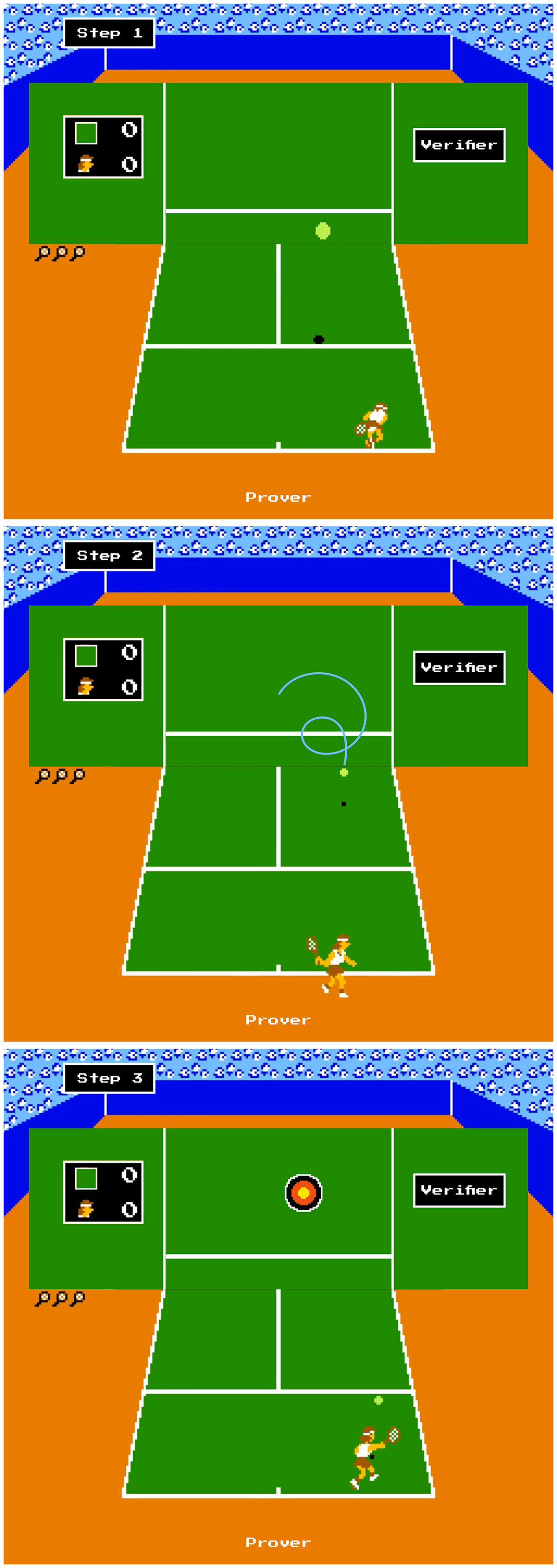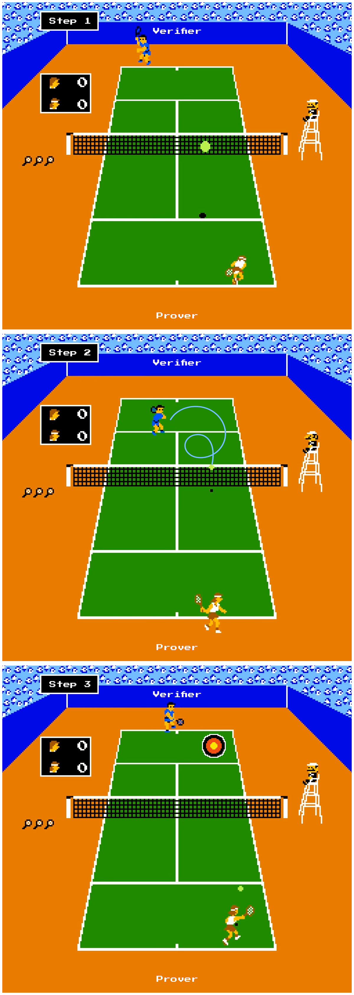 (1) The prover hits the ball to the verifier, and (2) the verifier sends a random return back to the prover—random speed, location, amount of spin, etc.—and (3) the prover must return the ball to a targeted spot on the court. If the prover hits the target, the verifier classifies them as a good tennis player. If they do not hit the mark, they are classified as a bad tennis player.